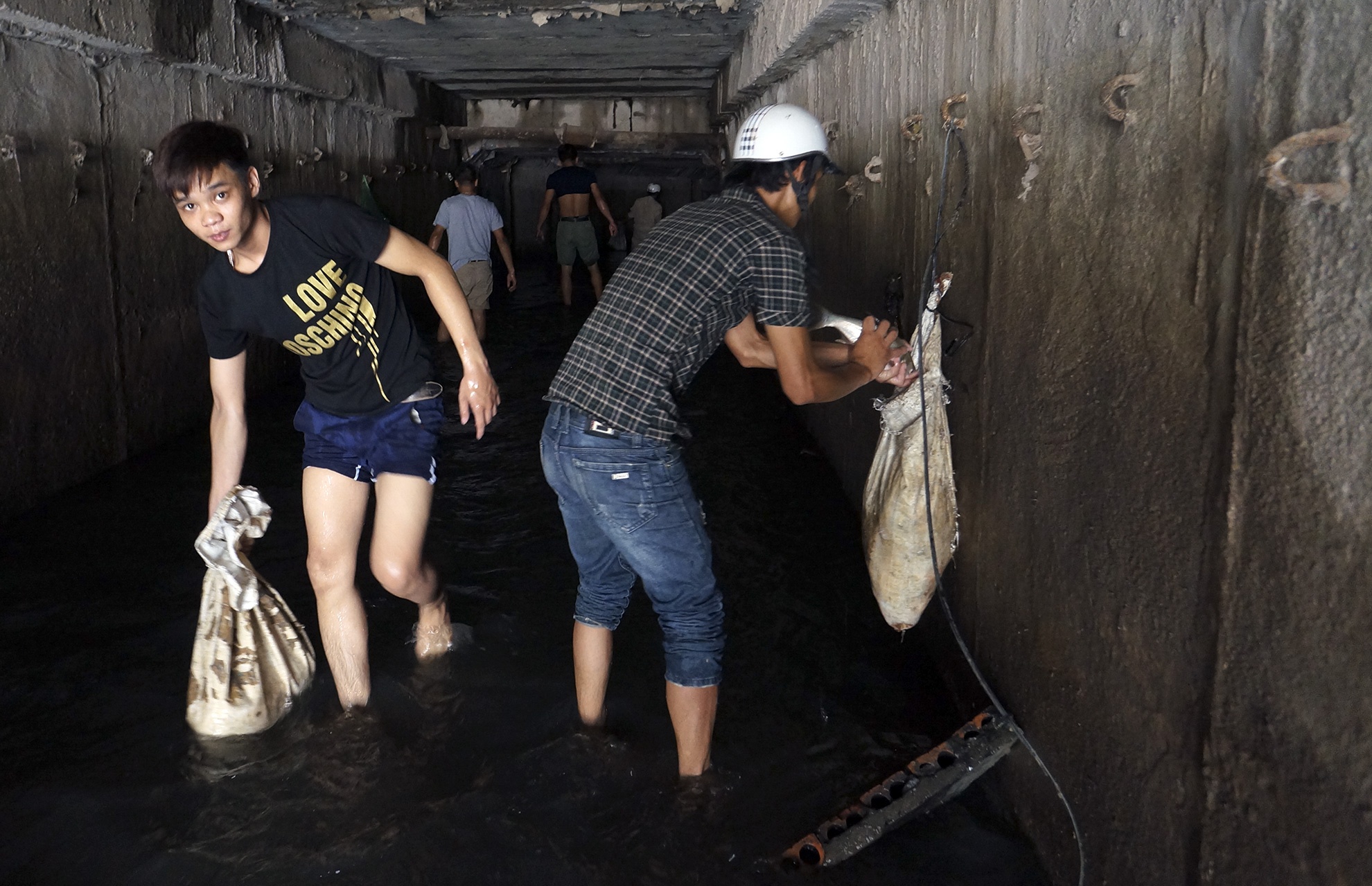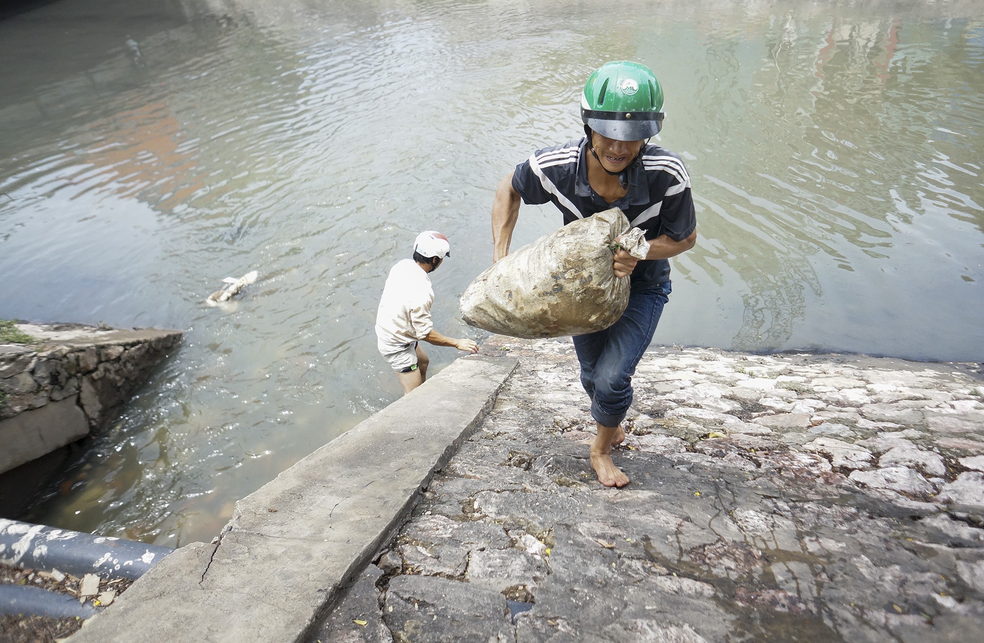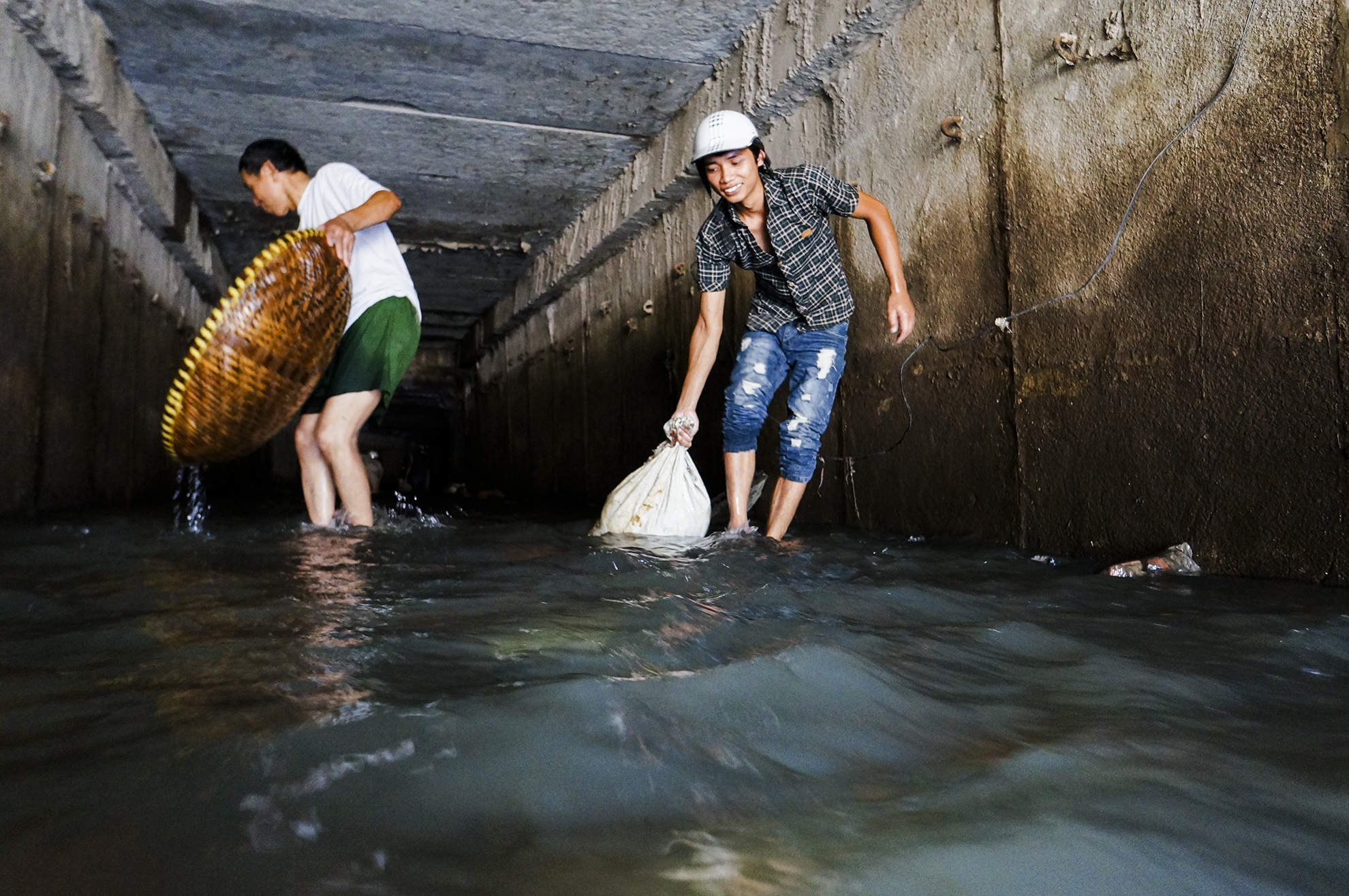 Sau trận mưa đêm 24/6, nhiều thanh niên ở Hà Nội đã bắt được hàng trăm con cá bằng tay dưới ống cống gần sông Kim Ngưu. Có người đã thu lượm được vài bao tải mang ra chợ bán.