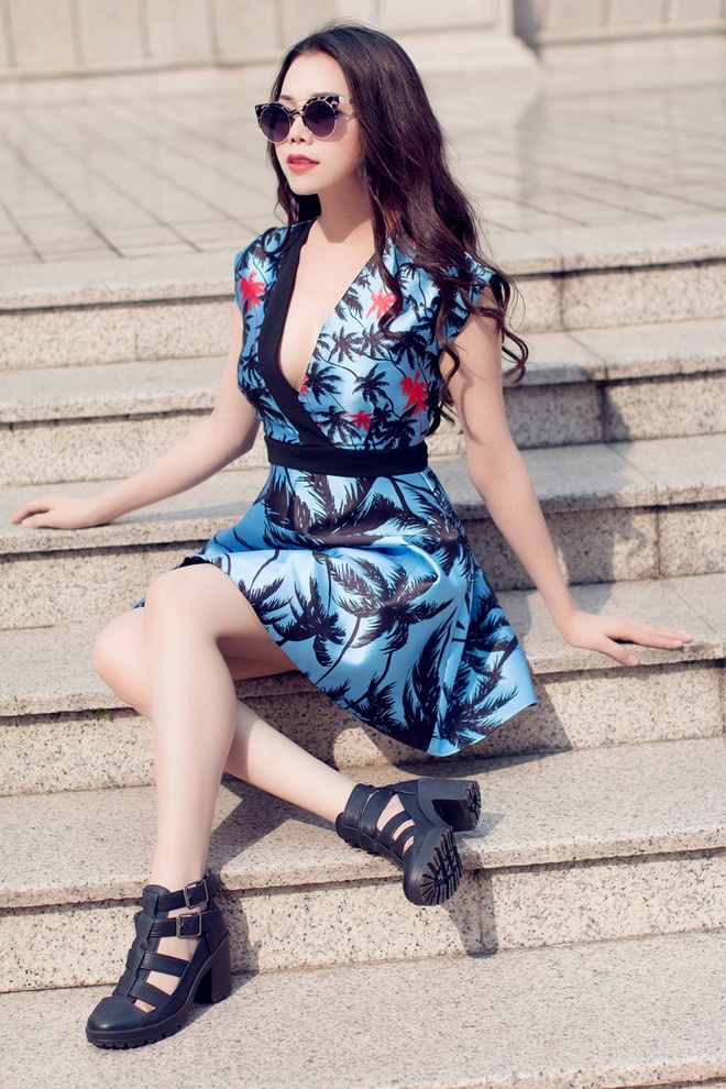 Bộ trang phục nữ tính, có họa tiết cây dừa hợp xu hướng mùa hè của Trà Ngọc Hằng cũng không phù hợp với đôi giày sandals bụi phủi, khỏe khoắn.