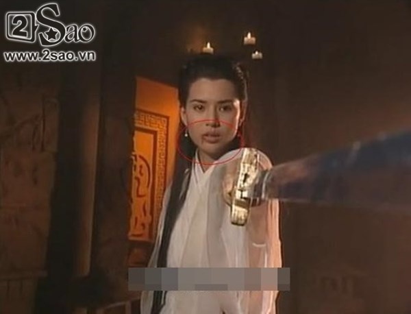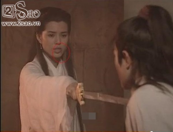 | Ban đầu, vết máu ở trên khóe miệng phải của Tiểu Long Nữ (Lý Nhược Đồng). |