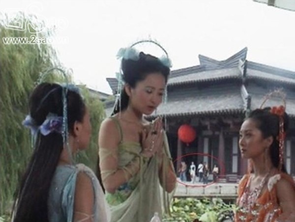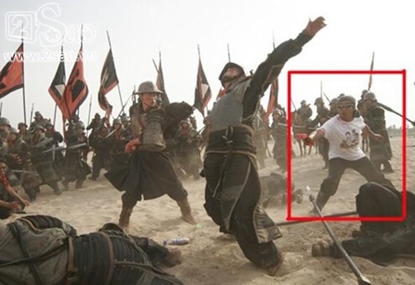 | Một anh chàng diện trang phục hiện đại xuất hiện trong cảnh quay chiến trận của phim cổ trang. |