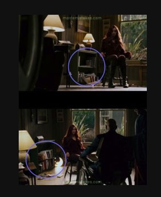 X-Men: The Last Stand (2006): Khi Magneto (Ian McKellen đóng) và Charles Xavier (Patrick Stewart đóng) ở trong nhà của Jean Grey (Famke Janssen đóng), chồng sách bị đổ xuống và một số lượng lớn sách bị rớt ra ngoài. Vậy mà ở bức ảnh sau, chỉ có 2 quyển sách bị đổ và hầu hết những quyển còn lại vẫn nằm yên trong giá. |