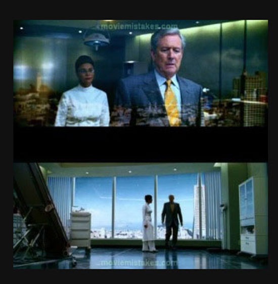 X-Men: The Last Stand (2006): Khi Angel (Ben Foster đóng) đang điều trị bệnh tại một tòa nhà chọc trời tại San Francisco. Ta có thể nhìn thấy một hình ảnh phản chiếu của thành phố trên cửa kính. Trong bức ảnh ngay sau đó, góc nhìn chuyển vào bên trong tòa nhà, song vẫn có thể nhìn thấy thành phố qua lớp cửa kính, nhưng cảnh về vịnh và đảo Alcatraz lại hoàn toàn khác. |