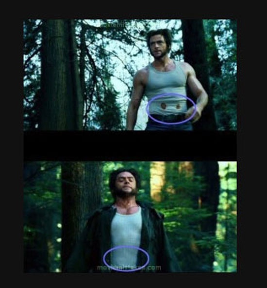 X-Men: The Last Stand (2006): Khi Logan (Hugh Jackman đóng) rút 2 chiếc sừng từ bụng mình, có thể thấy rõ 2 lỗ đẫm máu xuất hiện trên áo của anh. Trong bức ảnh tiếp theo, các lỗ máu đó đã hoàn toàn biến mất. |