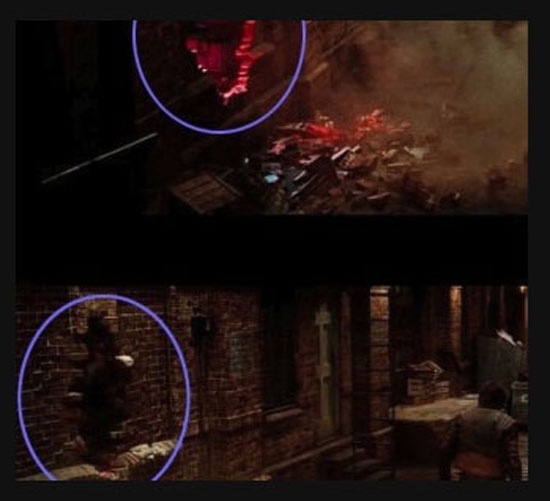 X-Men Origins: Wolverine (2009): Trong cảnh này, sau khi bị Gambit (Taylor Kitsch đóng) đẩy, Logan (Hugh Jackman đóng) đã đâm thủng bức tường.Trong bức ảnh thứ 2, khi Gambit trèo ra ngoài hẻm, lỗ hổng trên tường nhìn nhỏ và hẹp hơn. |