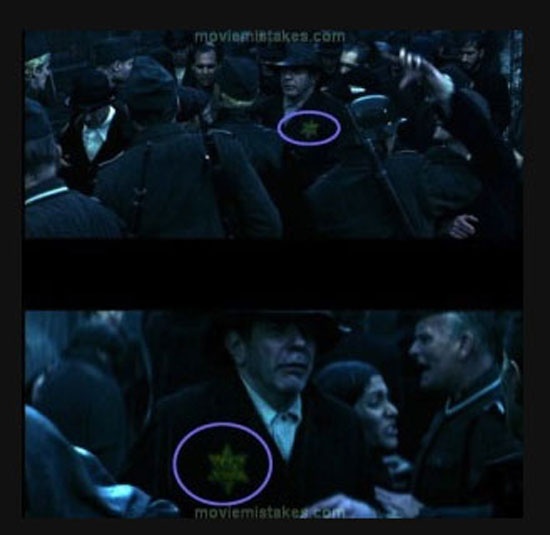X-Men (2000): Khi Magneto – còn trẻ (Brett Morris đóng) đang vật lộn với đám lính tráng tại trại tập trung, hình ngôi sao in trên chiếc áo khoác mà cha Magneto (do Kenneth McGregor thủ vai) mặc lúc đó đã bị chuyển dịch từ bên này sang bên kia. |