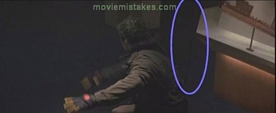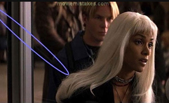 X-Men (2000): Ngay trước khi Sabretooth (Tyler Mane thủ vai) tóm lấy Storm (Halle Berry đóng) tại ga tàu, anh đã xô ngã người đàn ông đứng ngay sau Storm sang hẳn một bên. Có thể thấy rõ một sợi dây gắn liền với người đàn ông đó, trước khi nó bị kéo mạnh ra khỏi màn hình. |