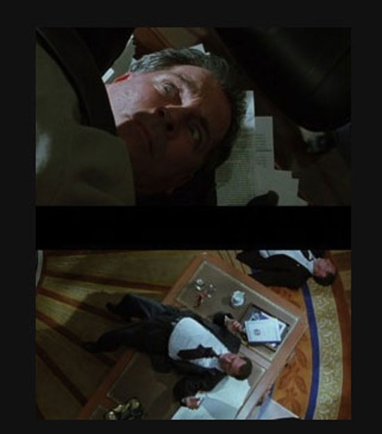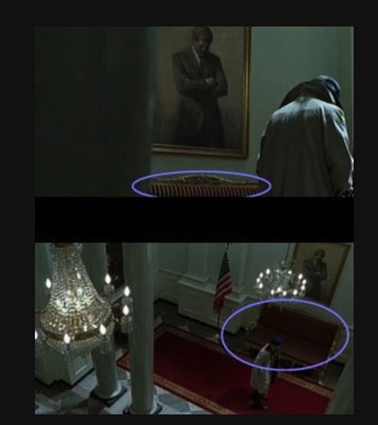 X2 (2003): Khi Nightcrawler (Alan Cumming đóng) ở bên trong phòng bầu dục (1 phòng trong Nhà Trắng), anh đã nhảy vào Tổng thống (Cotter Smith đóng). Trong bức ảnh, chiếc ghế da của Tổng thống được di chuyển từ bàn làm việc tới gần đầu của ông, trong khi ở bức ảnh thứ 2, ta không còn thấy chiếc ghế quay về hướng đó nữa. |