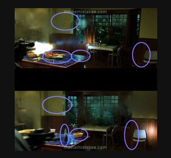 X2 (2003): Trong phân cảnh này, Wolverine (Hugh Jackman đóng) đã tấn công các thành viên của SWAT trong căn bếp của Học Viện dành cho những người đột biến. Bức ảnh đầu tiên cho thấy lỗ đạn ghim ở bức tường phía sau và một chai Dr.Pepper ở dưới sàn, trên mặt bàn là một rổ đựng đầy những thứ hoa quả gì đó. Trong bức ảnh sau, chai soda vẫn đặt yên trên bàn, tất cả hoa quả trong chiếc rổ đã không cánh mà bay, các lỗ đạn ghim trên tường ở những vị trí khác trước đó. Ngoài ra, trong bức ảnh thứ 2 thì chiếc ghế trắng đã được dịch chuyển gần lại phía cửa sổ. |