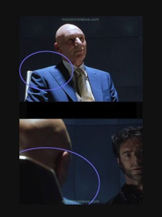 X2 (2003): Bức ảnh đầu tiên, khi Xavier (Patrick Stewart đóng) đang nói chuyện với Logan (Hugh Jackman đóng), vai của Xavier có vẻ ngang bằng chiều cao lưng tựa phía sau của chiếc ghế. Bức ảnh sau, phần lưng tựa của chiếc ghế dường như cao hơn hẳn, thậm chí cao gần bằng đầu. |