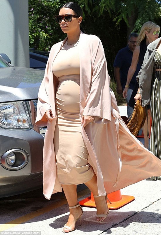 | Kim Kardashian hiện đang mang bầu con thứ hai ở tháng thứ năm. Cô mặc váy bó và áo choàng giống y như khoác chăn ra ngoài. Style trong thời kì bầu bí của ngôi sao truyền hình thực tế khiến fan ngán ngẩm và "cầu xin" cô nên chọn riêng cho mình một stylist. Thời mang thai con đầu lòng, cô cũng từng bị gán cho danh hiệu "thảm họa thời trang". |
