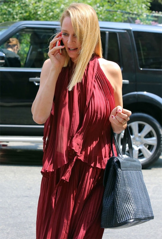 | Nữ diễn viên 45 tuổi Uma Thurman nhìn rất "quê mùa" trong bộ váy đỏ diêm dúa và sến sẩm khi xuất hiện trên đường phố New York. |