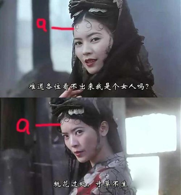 | Lúc đến động thổ phỉ, tóc trên trán của Xuân Tam Thập nương (Lam Khiết Anh đóng) xoắn vòng có đuôi (ảnh trên), nhưng chớp mắt trở thành một vòng tròn (ảnh dưới). |