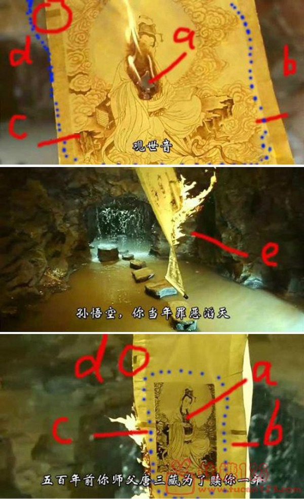 | Khi Chí Tôn Bảo cần bức tranh Quan Âm, lửa cháy từ giữa (ảnh trên), nhưng ngay sau đó khán giả lại thấy bức tranh cháy từ dưới lên (ảnh giữa) và rồi cháy từ bên trái sang (ảnh dưới). |