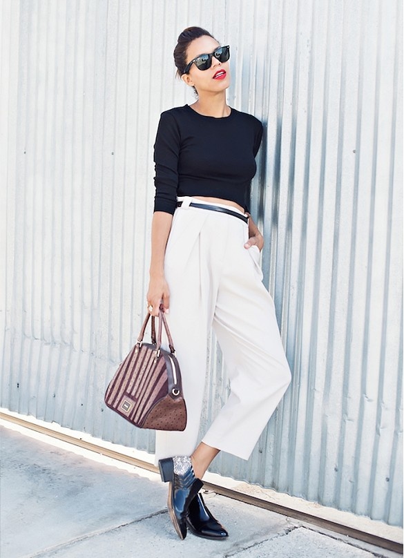| Gợi ý cho thời trang công sở với quần suông, áo len mỏng và thắt lưng. |