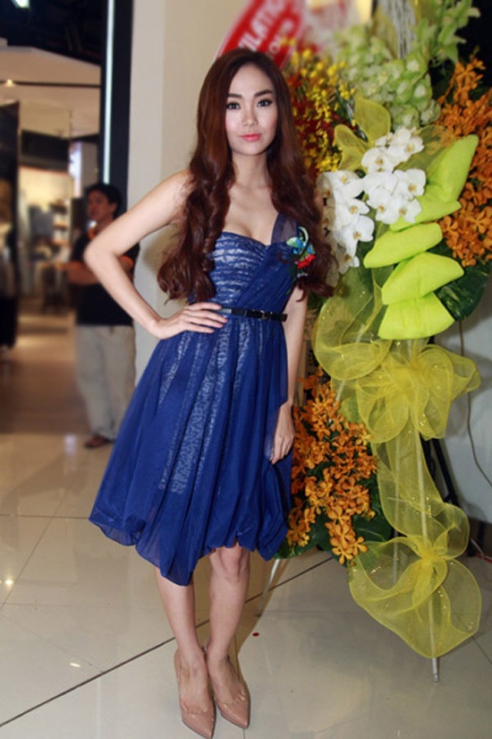 | Với đôi chân cong, Minh Hằng nên chọn những chiếc váy quá đầu gối để che đi khuyết điểm của mình. |