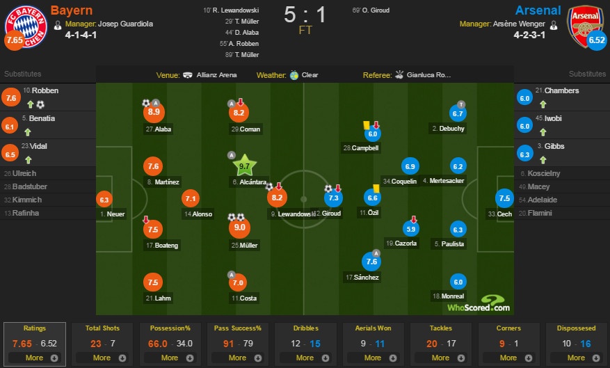 Arsenal hành quân tới Allianz Arena bằng sự tự tin cao độ nhờ phong độ ấn tượng tại Premier League và chiến thắng 2-0 trước chính Bayern cách đây 2 tuần. Tuy nhiên, thầy trò huấn luyện viên Arsene Wenger đã không thể lường hết sức mạnh ghê gớm của “Hùm Xám”.