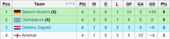 Trắng tay rời Allianz Arena, Arsenal đối mặt với nguy cơ bị loại rất cao bởi ở trận đấu cùng giờ, Olympiacos có cuộc lội ngược dòng ấn tượng trước Dinamo Zagreb. Chiến thắng kịch tính 2-1 giúp đại diện Hy Lạp có cùng 9 điểm như Bayern nhưng xếp dưới do thua chỉ số phụ. Trong khi cả Arsenal và Dinamo Zagreb mới nắm trong tay vỏn vẹn 3 điểm.
