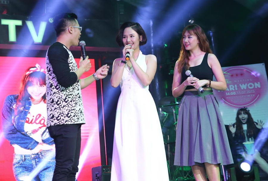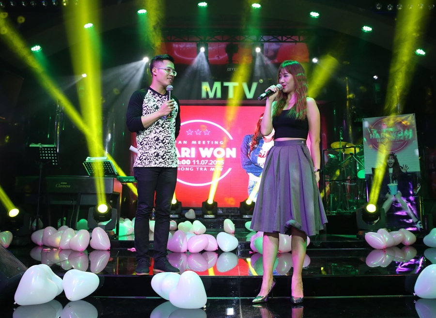 | Đông đảo người hâm mộ Hari Won đã tập trung tại phòng trà lớn nằm ở trung tâm quận 3, TP HCM. MC Quốc Bình giữ vai trò dẫn dắt chương trình. |