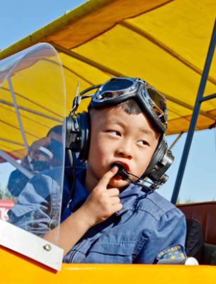 Ngày 31/8, bé He Yide, biệt danh Duoduo, tự lái máy bay quanh công viên Thiên nhiên Bắc Kinh trong vòng 35 phút. Người hướng dẫn cùng bay với Duoduo nhưng cậu bé không cần sự giúp đỡ. Cha bé, anh He Liesheng, cho biết anh sẽ liên hệ với tổ chức kỷ lục Guinness để con được công nhận là người đàn ông trẻ nhất tự điều khiển máy bay. Ảnh: Imaginechina.