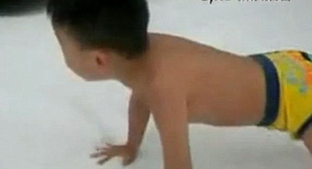 Duoduo từng mình trần chống đẩy giữa tuyết lạnh ở New York hồi tháng 1/2012 (ảnh trên). Thời gian sau đó, cha bé lại tiếp tục dạy bé đi thuyền giữa biển lớn. Dư luận phản ứng trái chiều về phương pháp dạy con của anh He. Nhiều người cho rằng, chế độ tập luyện của bé quá hà khắc. Ảnh: Sina.