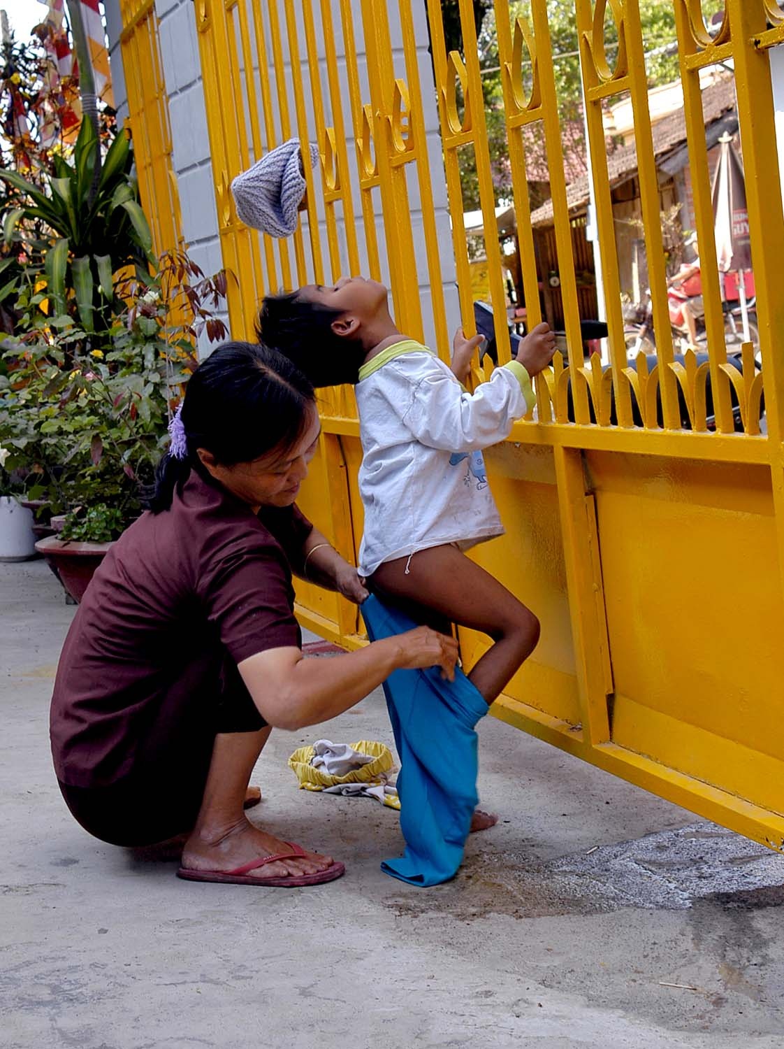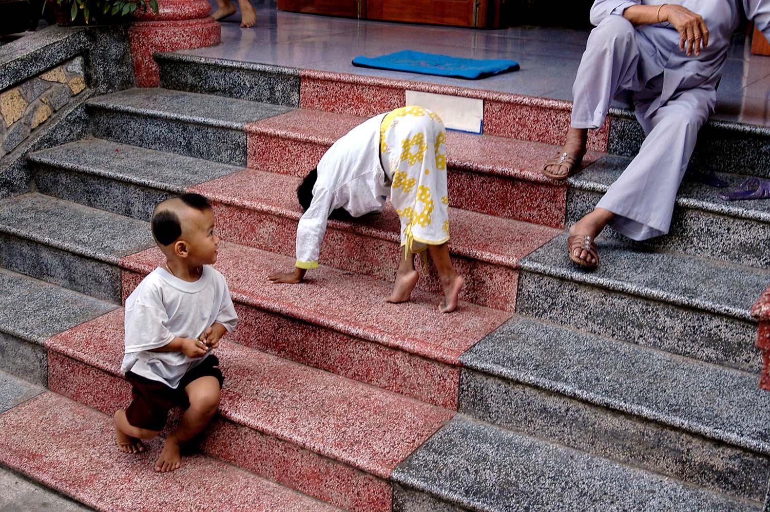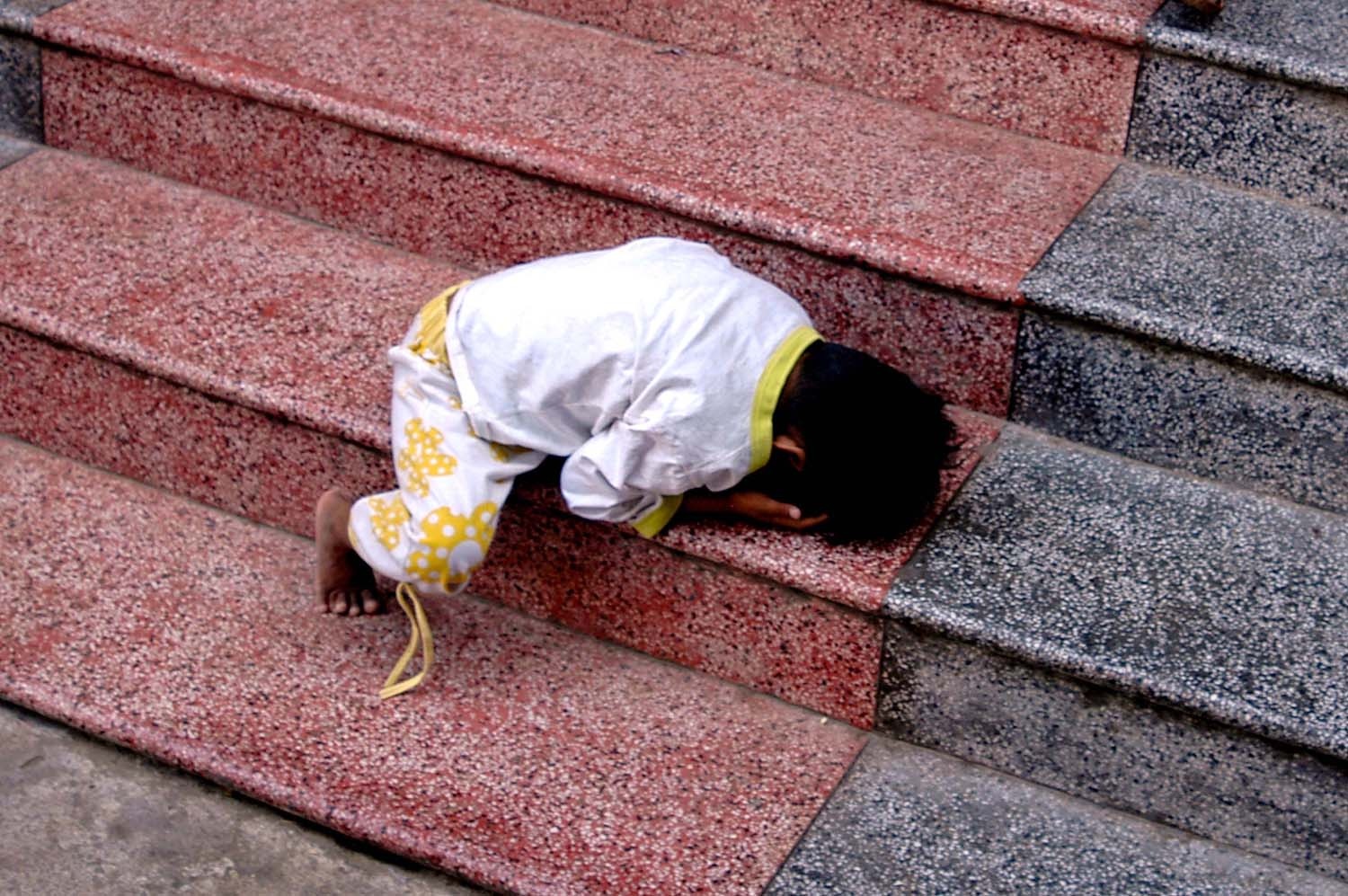 Khi phóng viên có mặt, bé đang leo lên bậc cấp nhà chùa bằng một động tác lạ. Tuy vậy, theo các ni cô, bé không bao giờ bị ngã.