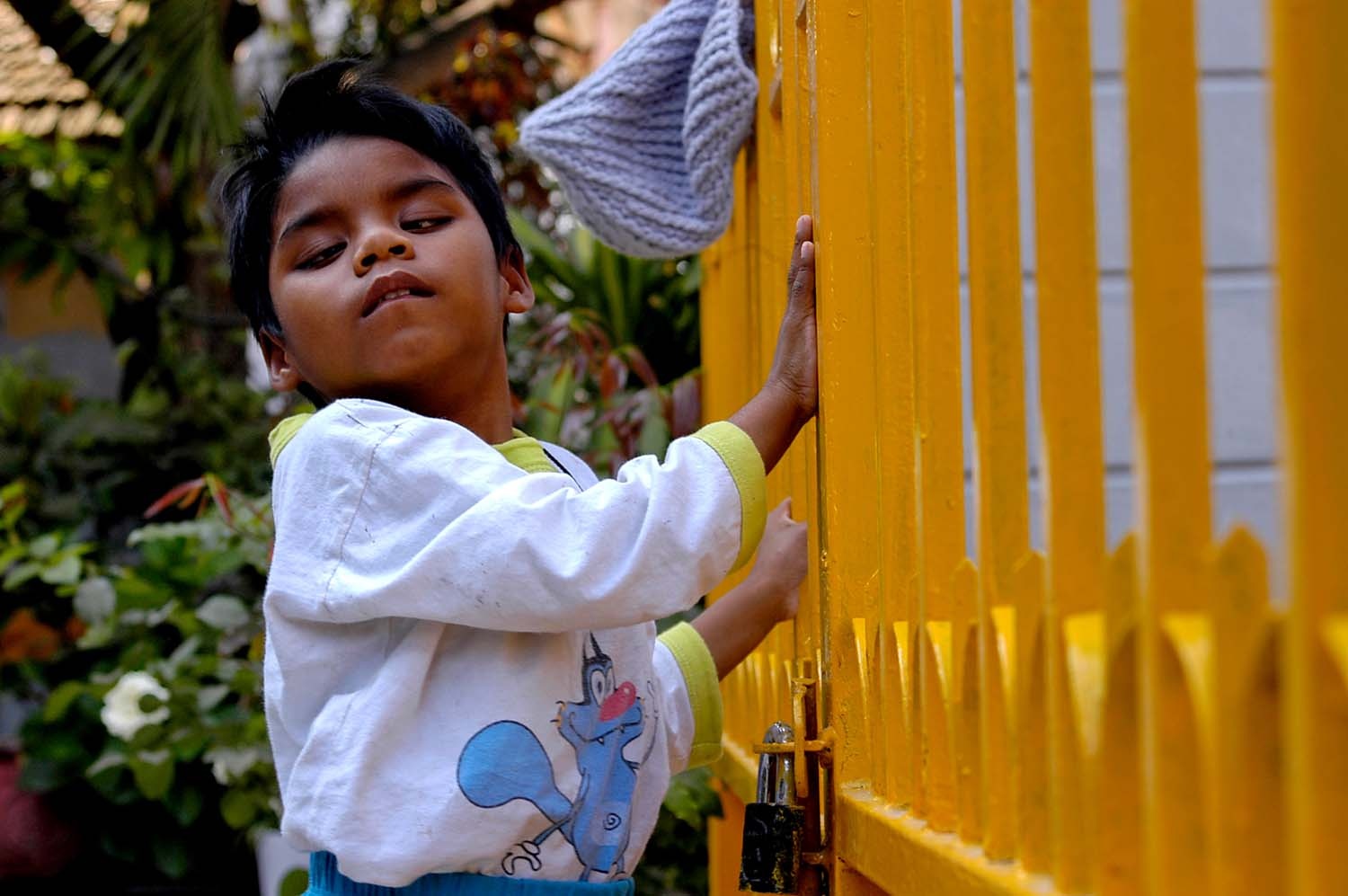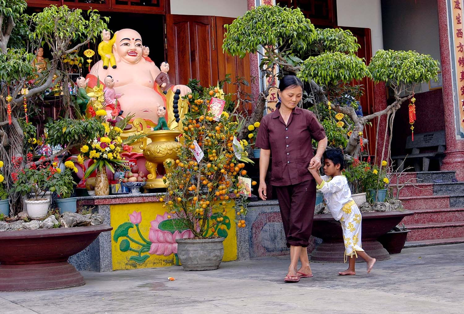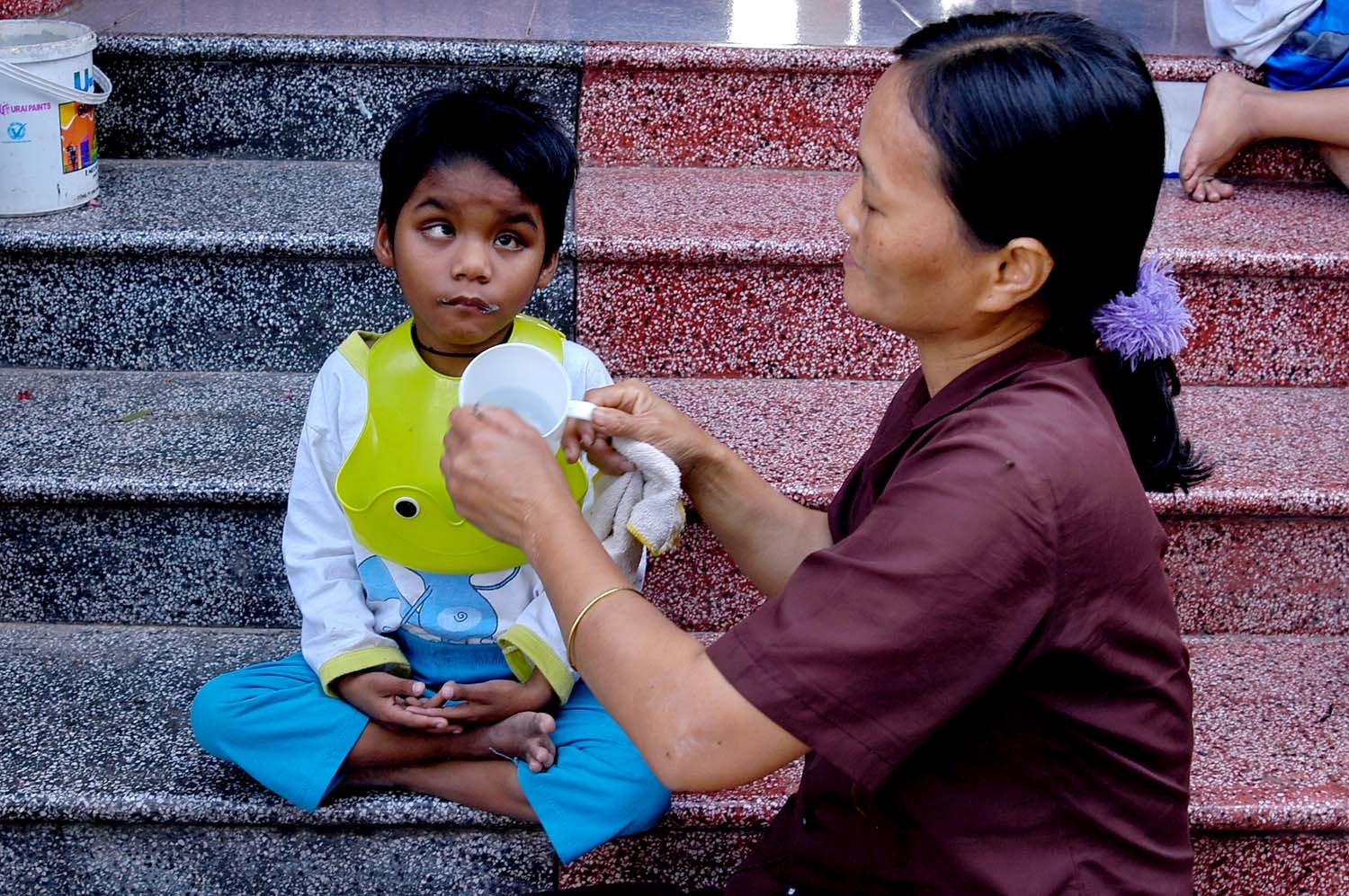 Khi phóng viên có mặt, bé đang leo lên bậc cấp nhà chùa bằng một động tác lạ. Tuy vậy, theo các ni cô, bé không bao giờ bị ngã.