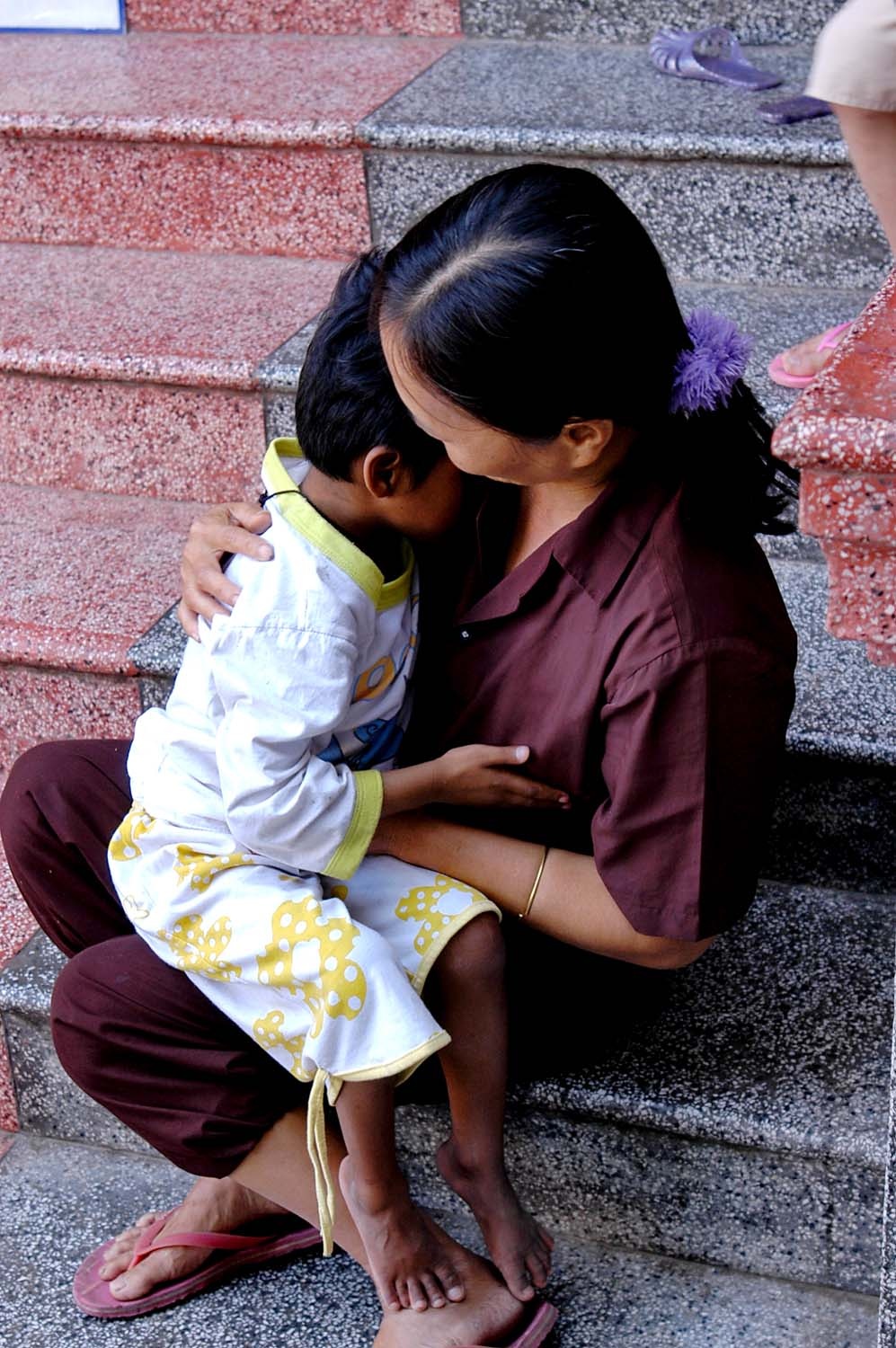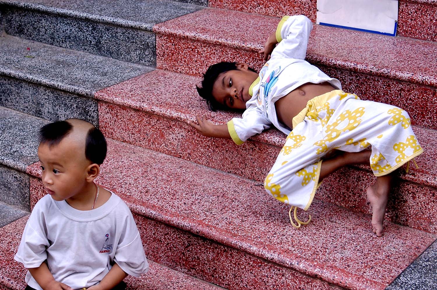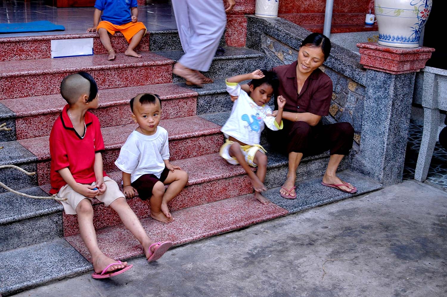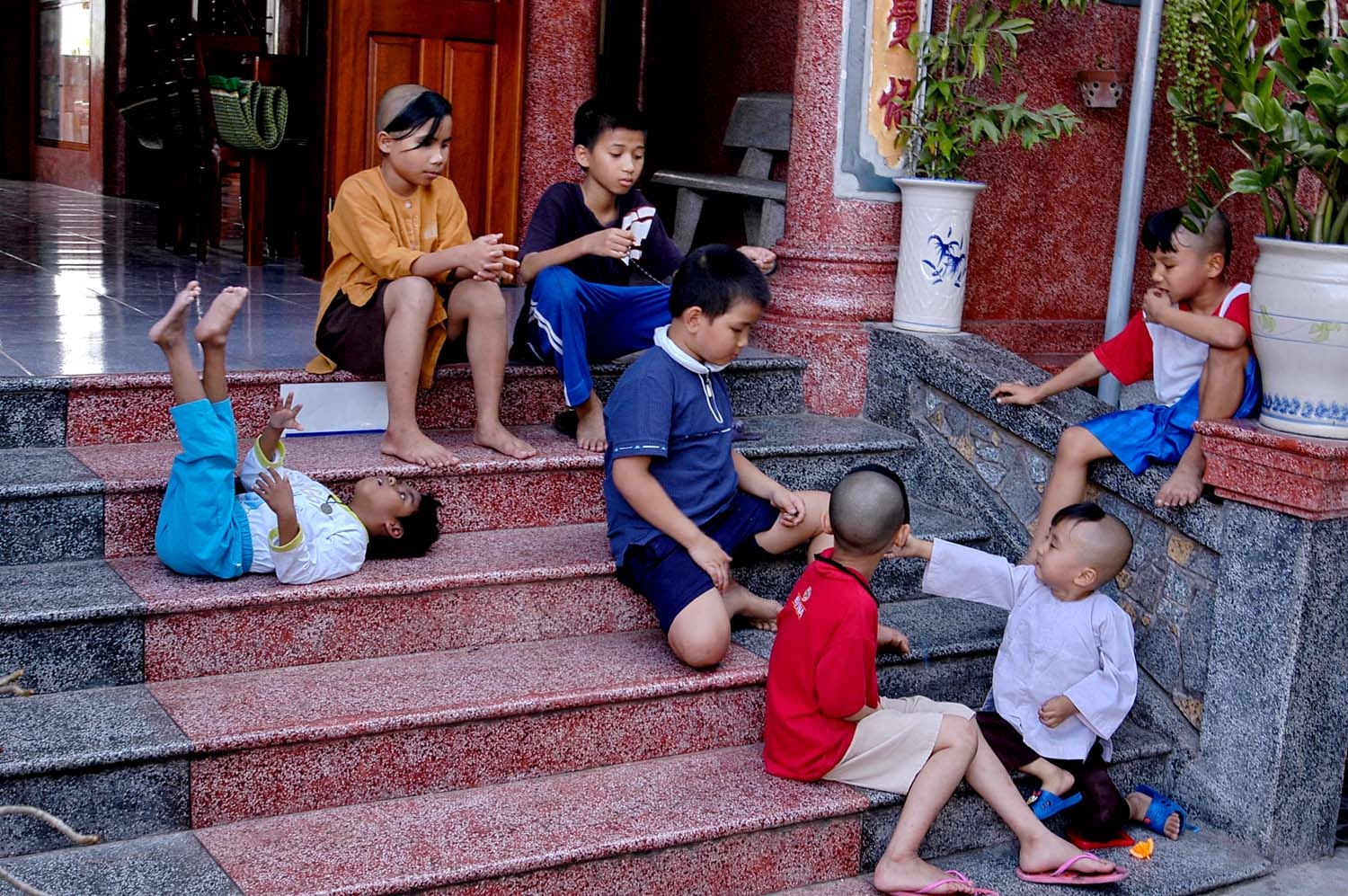 Bé thường thơ thẩn nằm chơi trên bậc cấp nhà chùa.