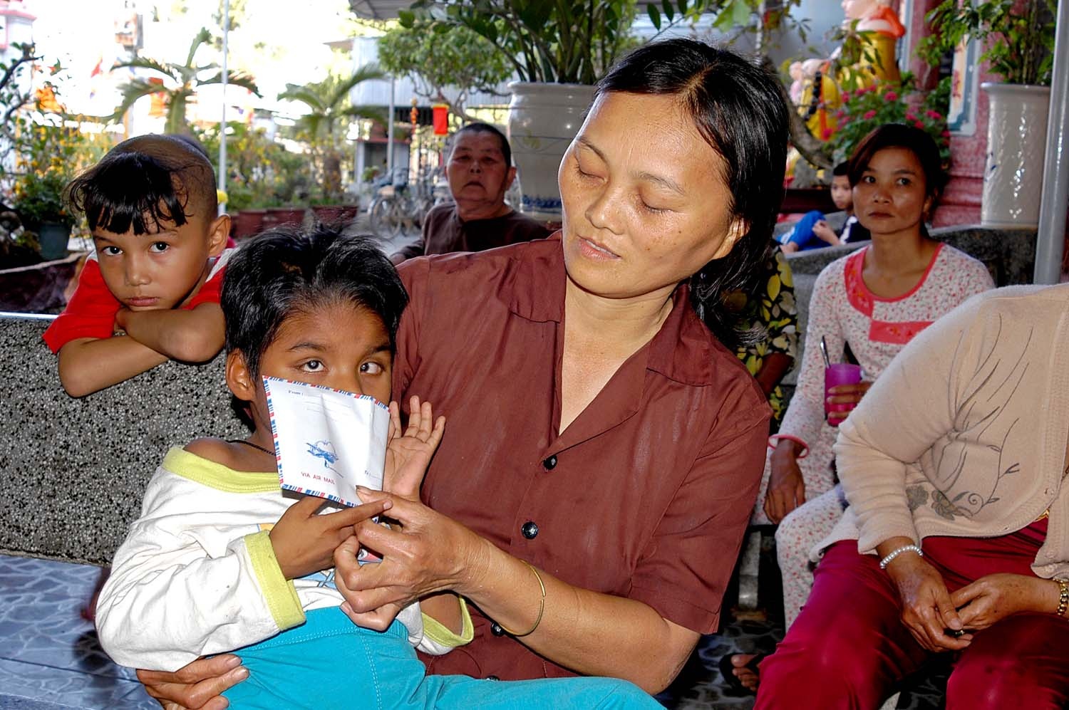 Chị Thắm đang tập đi cho bé trong sân chùa. Từ ngày sinh ra cho đến khi được sư thầy cùng các Phật tử phát hiện giúp đỡ, Ni không biết nói, không thấy đường, cũng chẳng thể nghe và đi lại được. Ngoài ra em còn bị hẹp van tim và phổi.