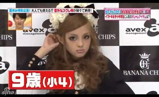 | Những hình ảnh này được cắt lại trong một chương trình truyền hình của Nhật Bản. Cô bé trong ảnh được mệnh danh là Lolita xứ phù tang. Với kiểu tóc và cách trang điểm lòe loẹt, cầu kỳ kiểu cách, nhiều người nhận xét cô bé giống một phụ nữ 32 tuổi hơn là một cô bé 9 tuổi. |