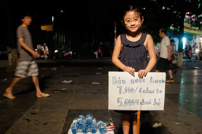 | Hình ảnh bé gái đứng bán nước trên vỉa hè kiếm tiền mua sách và học bơi nhanh chóng thu hút sự chú ý, quan tâm từ cộng đồng mạng. Ảnh: Humans of Hà Nội. |