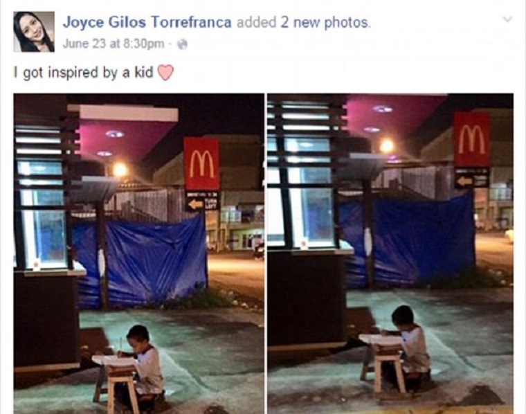 Trước đó, tháng 7/2015, hình ảnh bé trai người Philippines, Daniel Cabrera, tận dụng ánh đèn từ cửa hàng đồ ăn nhanh để học bài trên chiếc bàn gỗ kê tạm cũng khiến cư dân mạng xúc động.