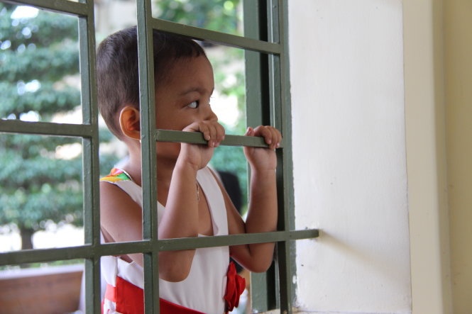 | Kim Ngân ngây thơ ngó qua song cửa, nhìn mẹ đang bị tòa xét xử. |