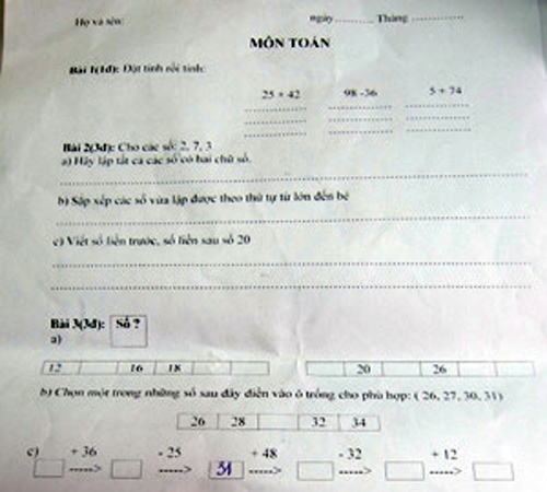 “Cô giao cho 7 phiếu môn toán mang về, để luyện từ nay đến lúc thi học kỳ sau đợt nghỉ lễ 30/4. Một phiếu đề bài có 5 câu hỏi, mỗi câu hỏi có ít nhất 2 phần, rồi mỗi phần toàn cộng và cô giáo yêu cầu là làm trong vòng một tiếng. Nếu trẻ xoay xở được thì sau này nước mình nhiều… Ngô Bảo Châu lắm” - Chị Trang hài hước.