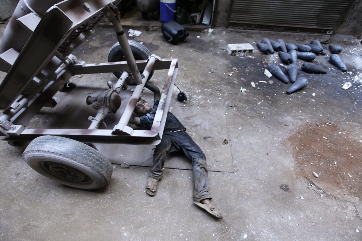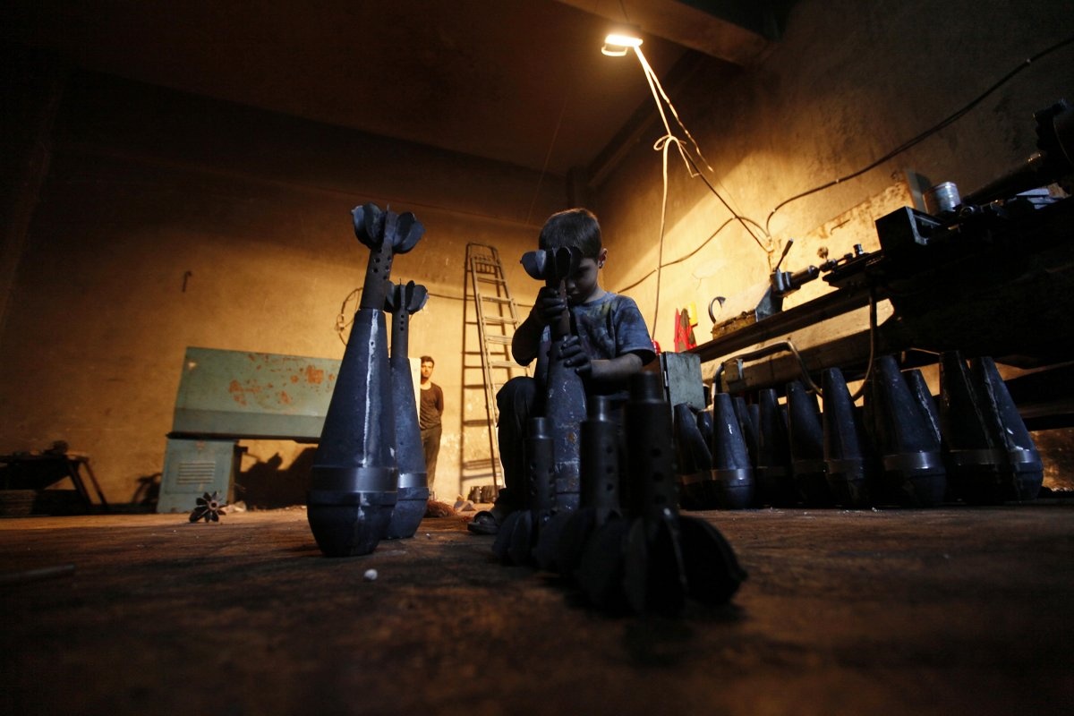 | Cậu bé 10 tuổi bê một quả đạn pháo trong nhà máy. Ảnh: Reuters |