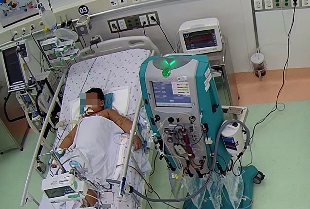 Trẻ được lọc máu liên tục vì biến chứng sốc sốt xuất huyết. Ảnh: BVCC. |