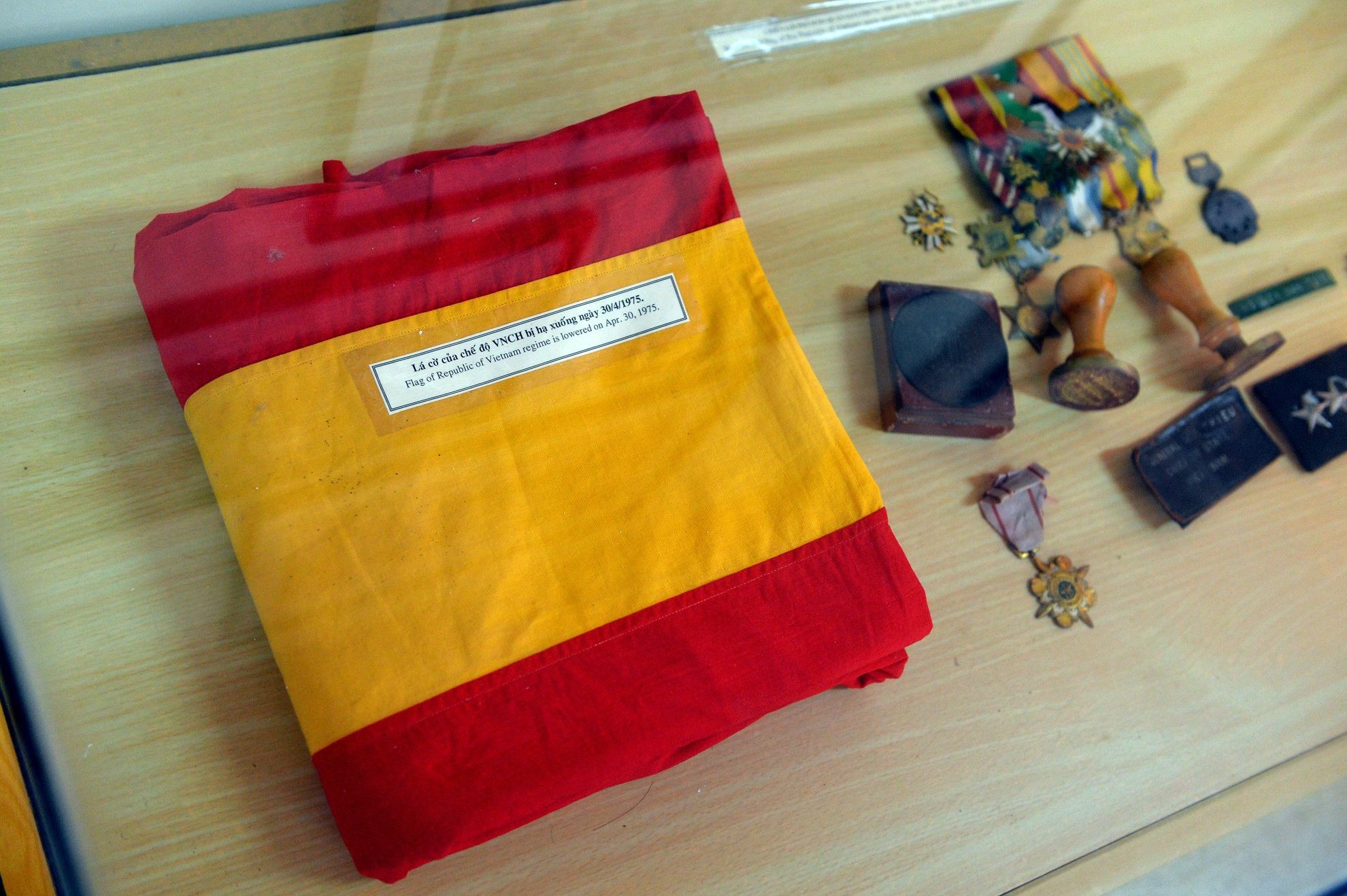 | Lá cờ, con dấu và huân huy chương thứ hạng cao của chế độ cũ mà bộ đội ta thu được trong Dinh Độc Lập trong ngày 30/4/1975. |