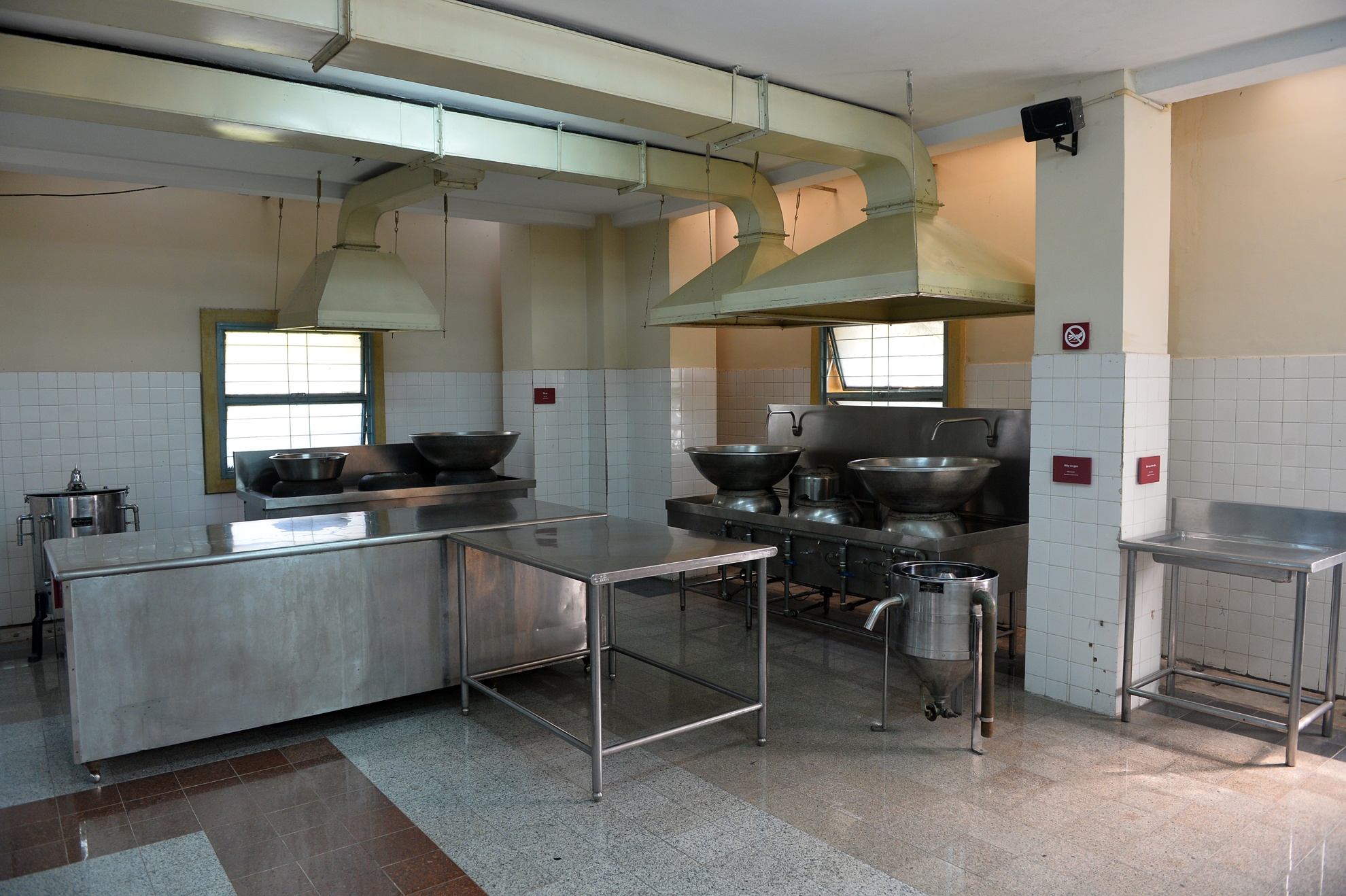 | Bếp bên trong Dinh. Đây là nơi nấu ăn phục vụ các buổi tiệc chiêu đãi trọng thể, được trang bị hiện đại như bếp của khách sạn 5 sao thời bấy giờ. Các thiết bị đều được làm bằng inox, sản xuất tại Nhật 1966, sử dụng gas và điện, có kho lạnh riêng biệt để bảo quản thức ăn, có hệ thống hút khí và thang máy vận chuyển 100kg lên các tầng trên.