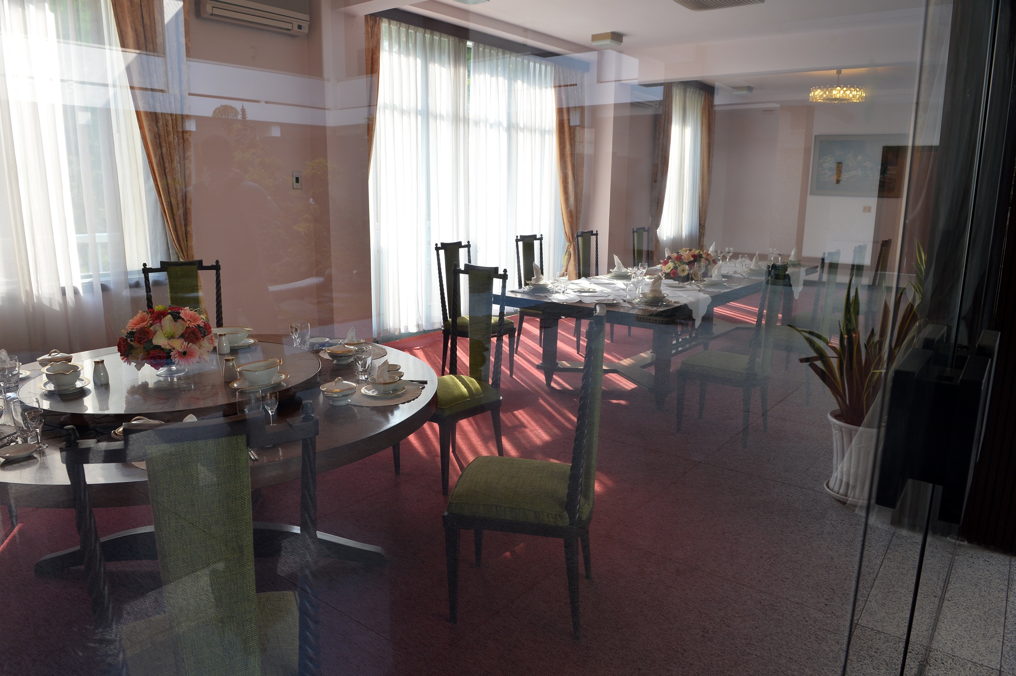 | Phòng ăn với buồng kính, trải thảm sang trọng, sạch sẽ.