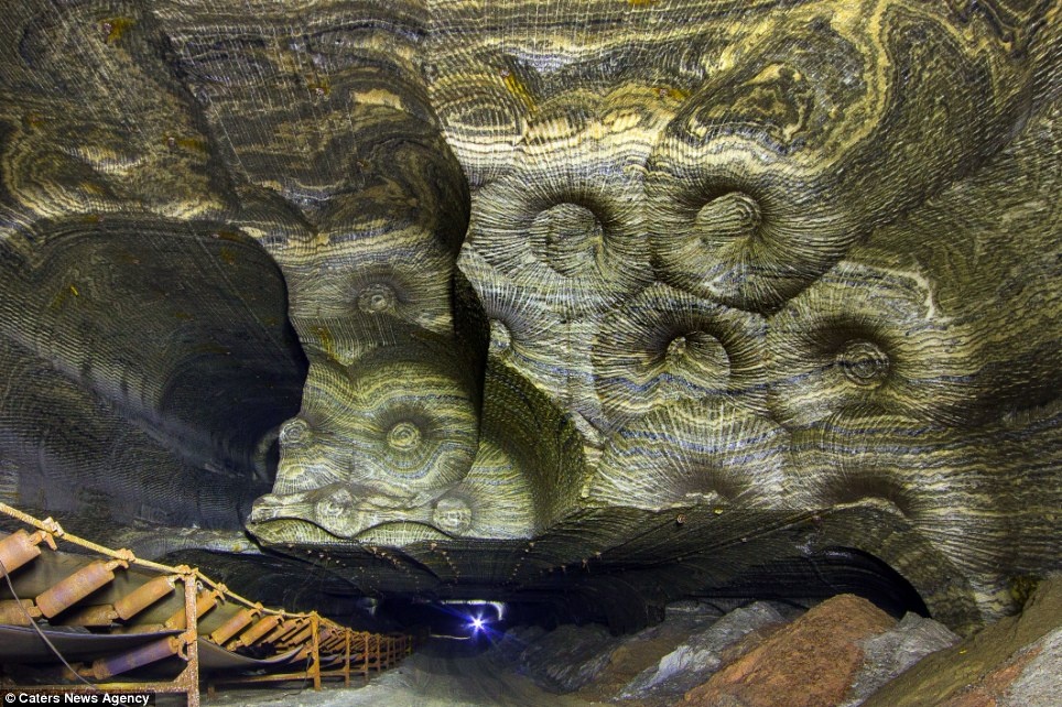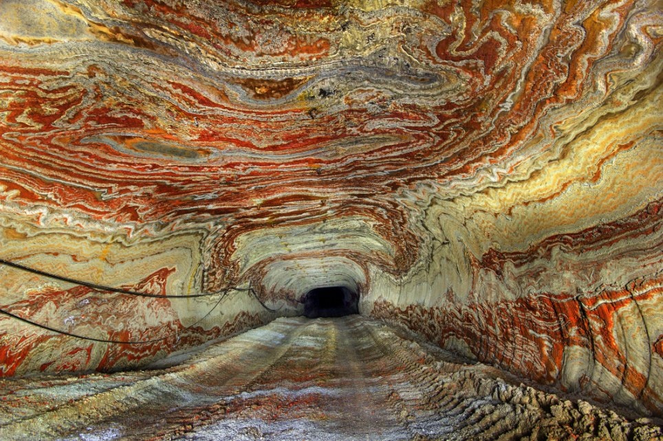 Quá trình khai thác muối cacnalit phục vụ ngành công nghiệp sản xuất phân bón làm lộ ra những hình thù kỳ dị trên vách khu mỏ. Ảnh: CNA. |