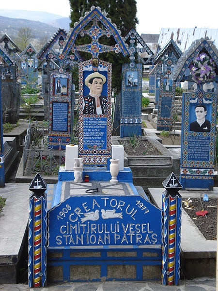 | Stan Ioan Patras, một nghệ sĩ địa phương, là người đầu tiên khởi xướng cách trang trí mộ sặc sỡ như ngày nay. Ông là người khắc bia mộ đầu tiên trong làng vào năm 1935. Đến những năm 1960, khoảng 800 bia mộ tương tự như vậy xuất hiện tại nghĩa trang Merry. |