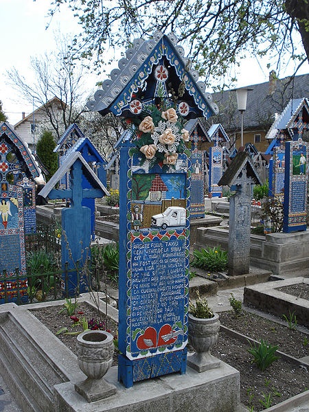 | Cổng nghĩa trang Merry, hay nghĩa trang Vui vẻ, ở làng Sapanta, hạt Maramureş, Romania. Nghĩa trang này nổi tiếng với cách trang trí mộ sặc sỡ với màu xanh là màu chủ đạo. |