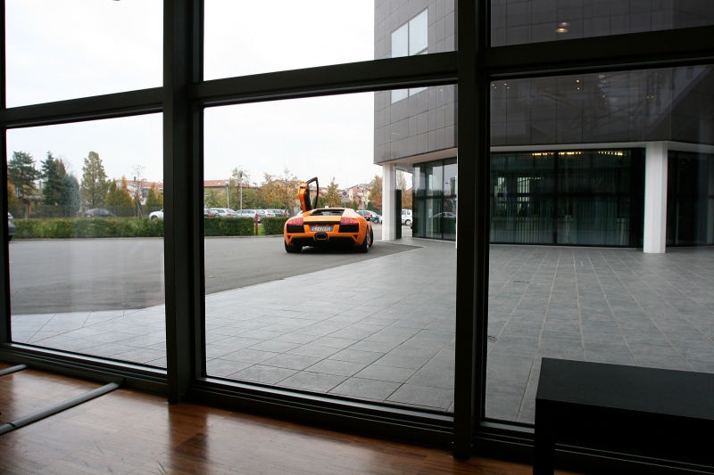 | Lamborghini thực sự biết cách nuôi dưỡng những đam mê của bất kỳ một ai đang làm việc tại nhà máy, khi hãng siêu xe Ý bố trí những không gian thoải mái nhất cho đội ngũ đang thổi hồn và thả tình yêu vào các đường nét trên sản phẩm. Cửa kính được tận dụng triệt để nhằm tận dụng ánh sáng tự nhiên. Ngoài các khu vực sản xuất, nhà máy còn có các khu vực trưng bày, phòng triển lãm, cửa hàng, quán cafe, khu vực mua sắm... Trên hình là bức ảnh được chụp từ phía trong phòng triển lãm. Nhìn ra phía sảnh là một chiếc Lamborghini trong khi phía xa là rất nhiều xe Volkswagen và Audi tại bãi đỗ xe của nhân viên. |
