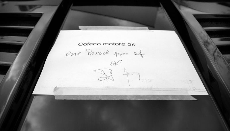| Những mảnh giấy được dán lên mỗi chiếc xe khi hoàn thiện với chữ ký của người chịu trách nhiệm chính. Sau đó, xe sẽ được chuyển tới sân giữa hai tòa nhà - một trong những khu vực bí hiểm nhất hạn chế người qua lại và khách tham quan. |