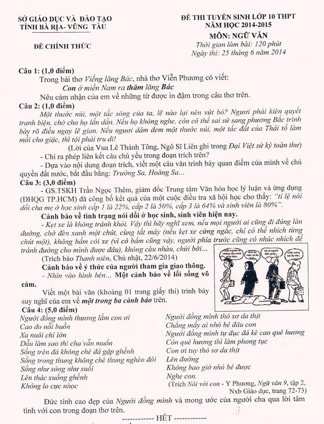 Đề thi môn Ngữ văn tuyển sinh vào lớp 10 tỉnh Bà Rịa - Vũng Tàu: