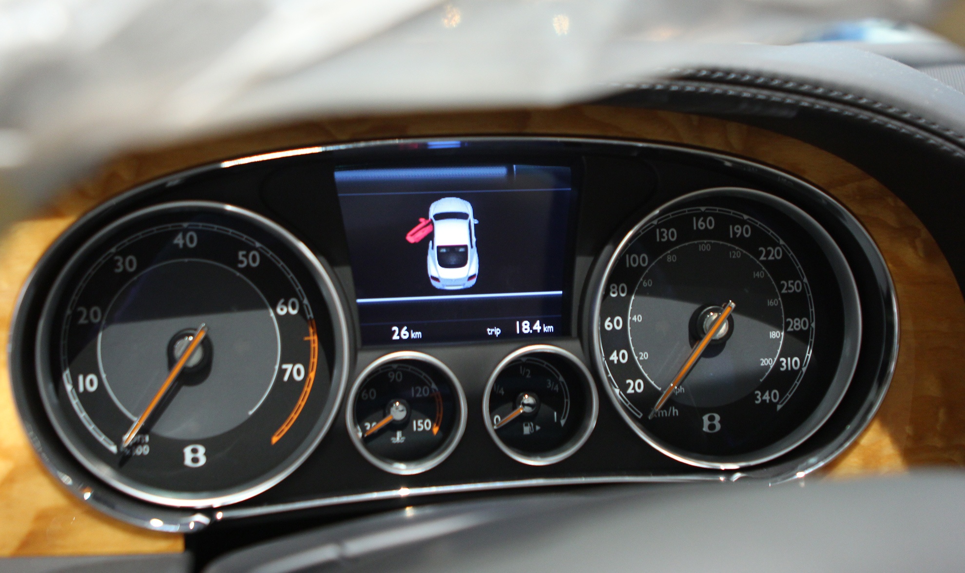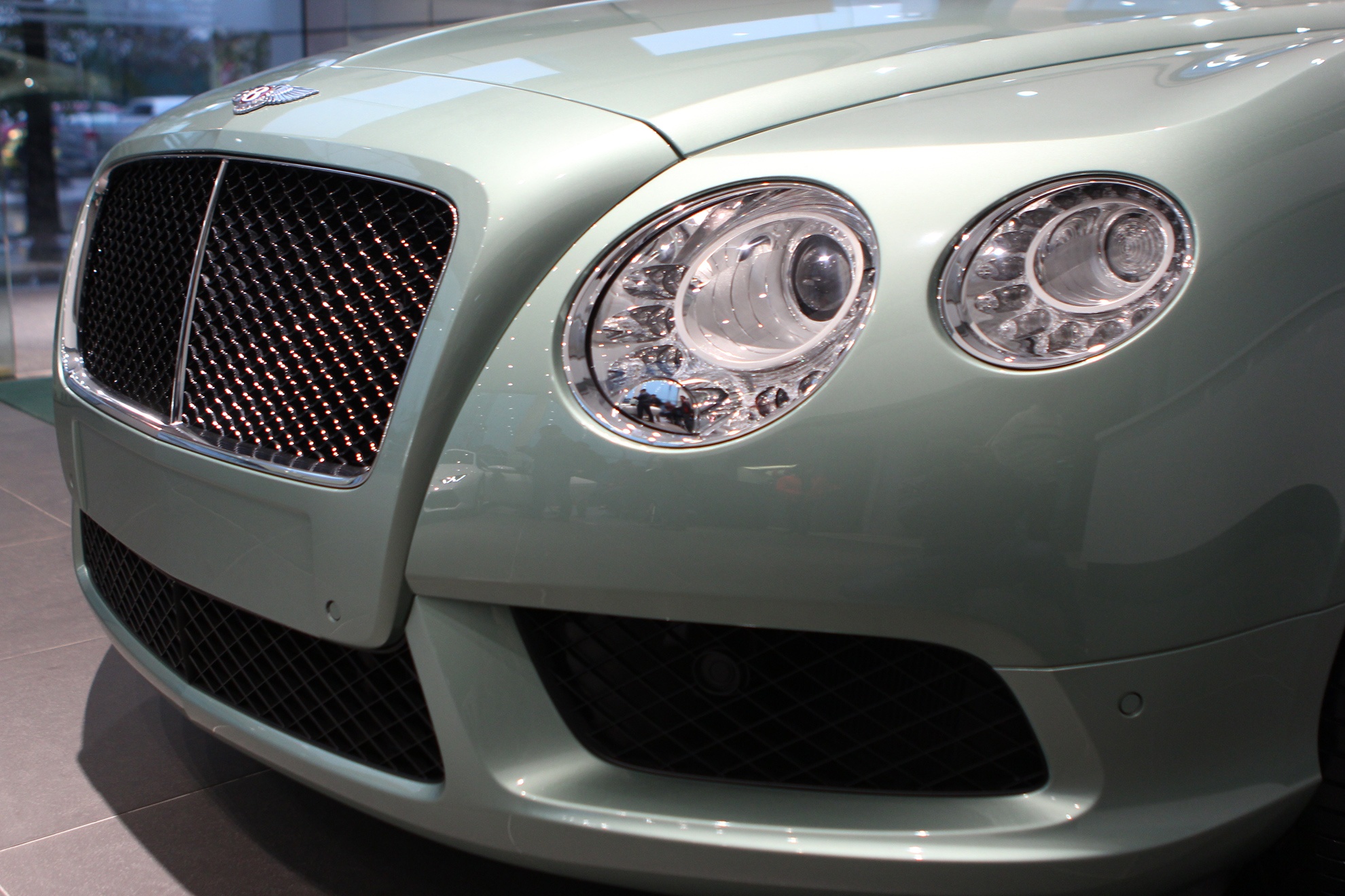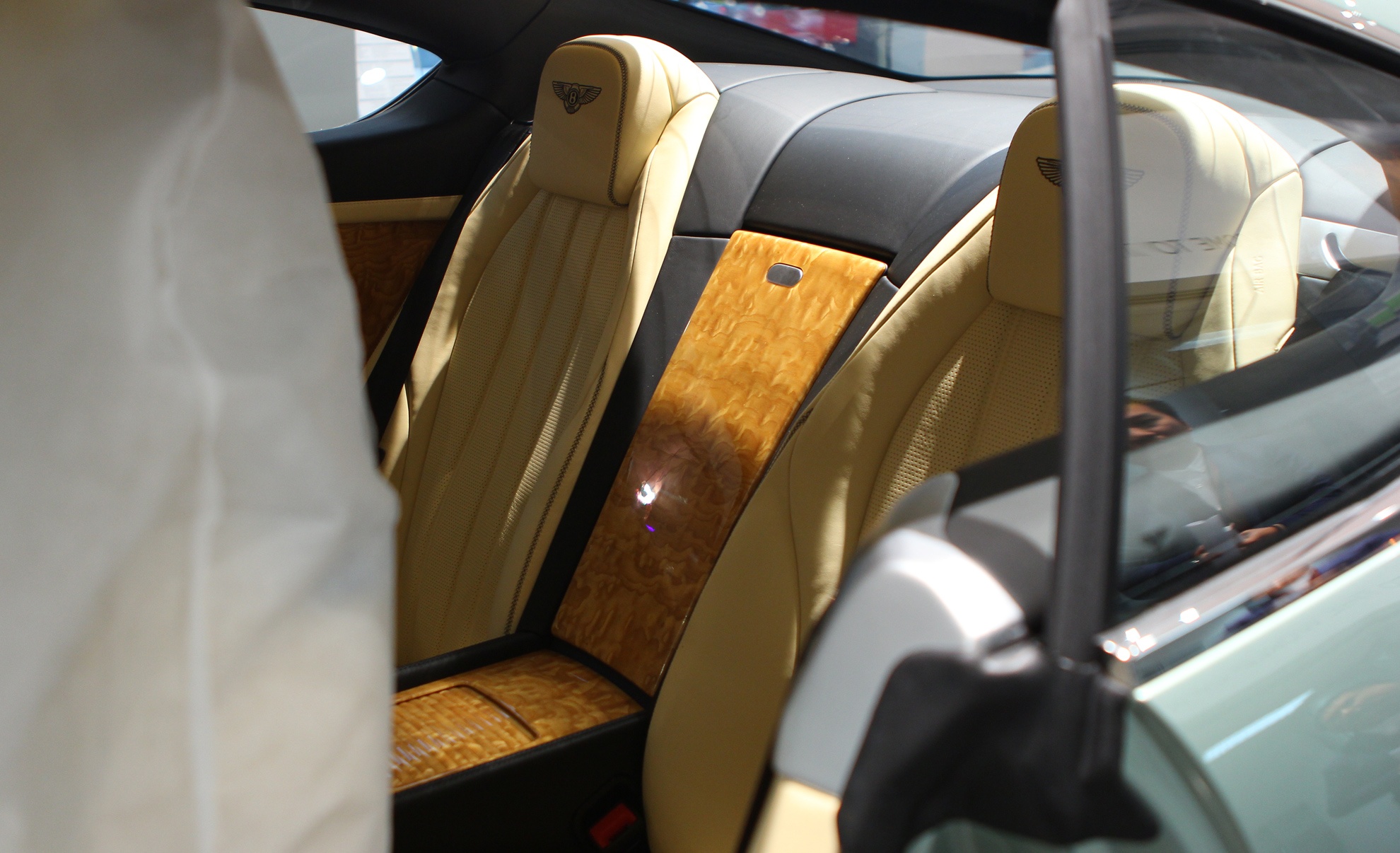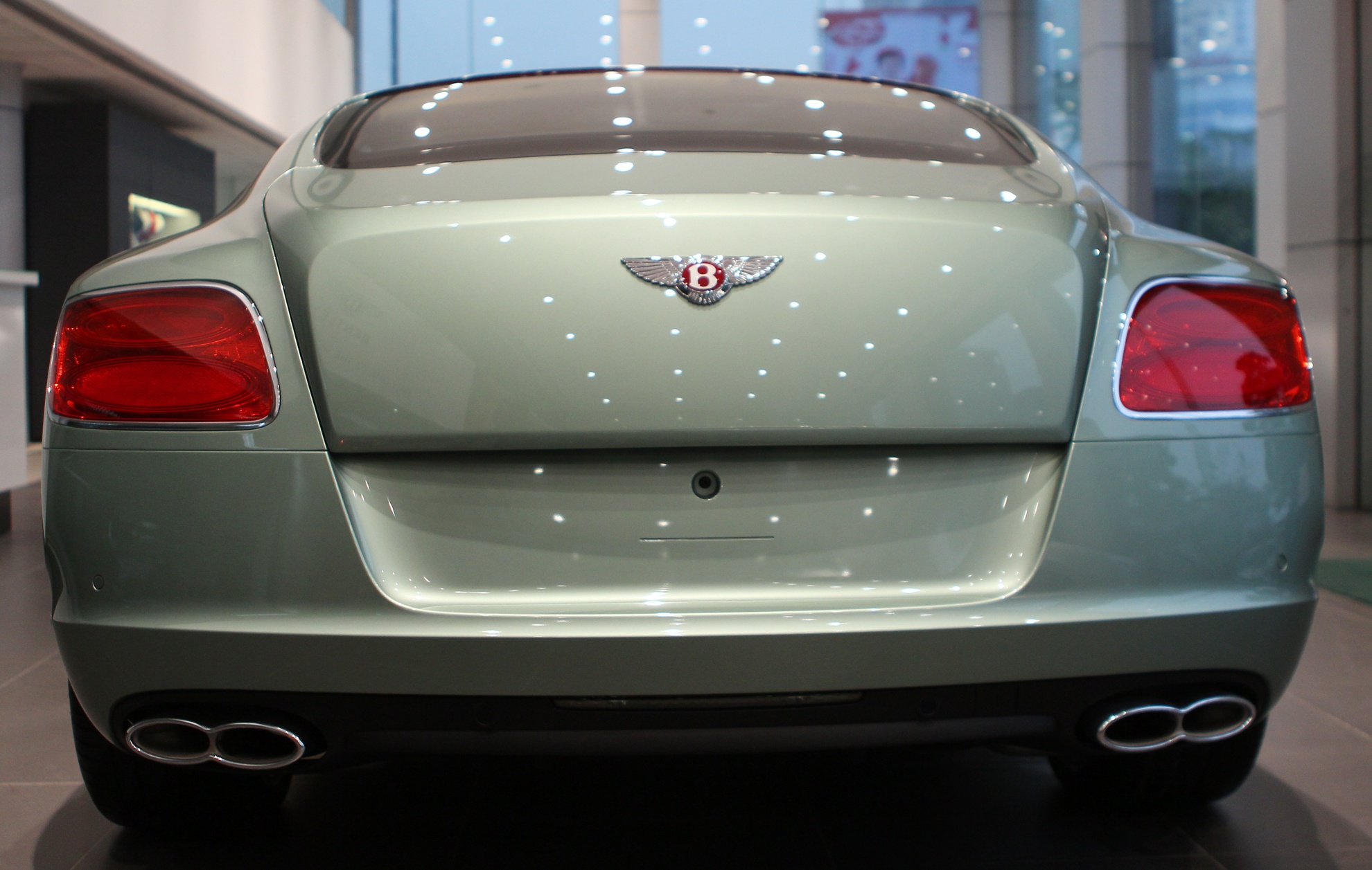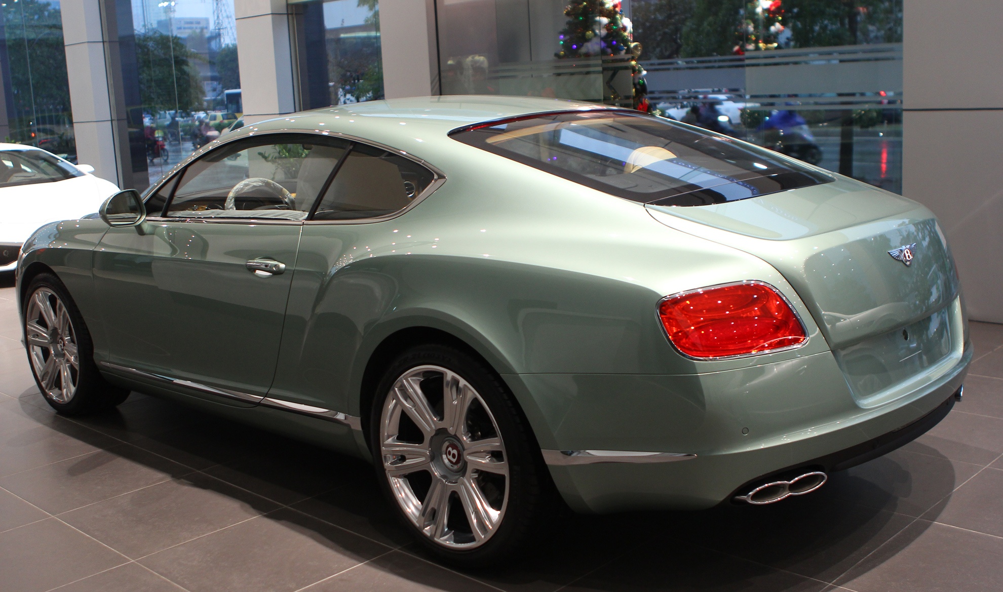 | Một số đặc điểm nhận diện khác của phiên bản GT V8 so với bản W12 như logo chữ B trên nền đỏ, hệ thống ống xả với chụp ống xả kiểu số 8. |