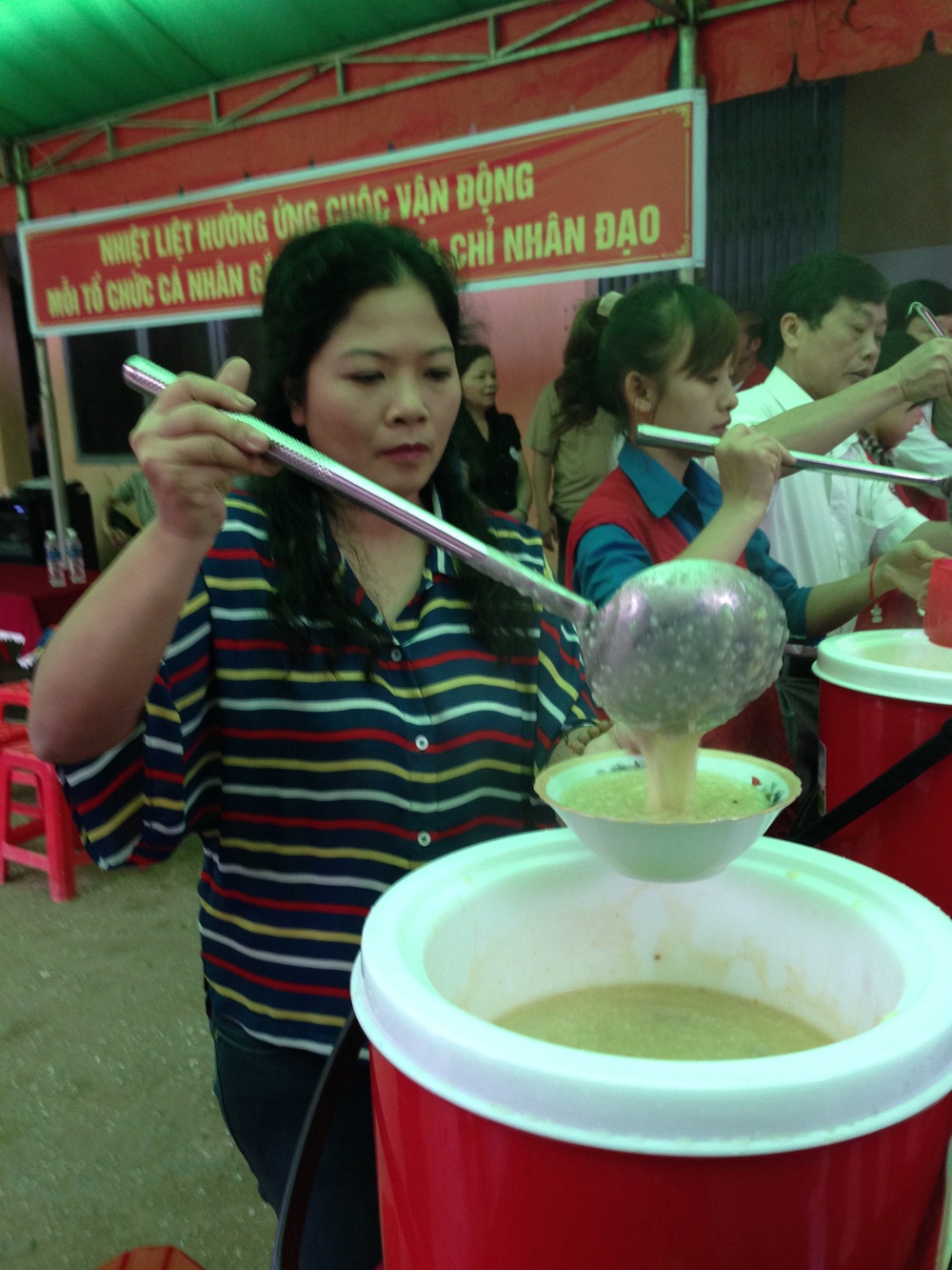6h sáng, những đầu bếp tình nguyện của bếp ăn tình thương đã có mặt đông đủ và bắt tay vào công việc. Mọi người tất bật cắt, gọt, xào, nấu…. để chuẩn bị 250 suất cháo cho các bệnh nhân nghèo đang nằm điều trị tại bệnh viện huyện Thạch Thành. Trao bát cháo cho bệnh nhân, nhìn ánh mắt và nụ cười của họ dù hơi mệt nhưng trong lòng mỗi người ai cũng thấy vui, hạnh phúc, ấm áp và tràn đầy yêu thương.