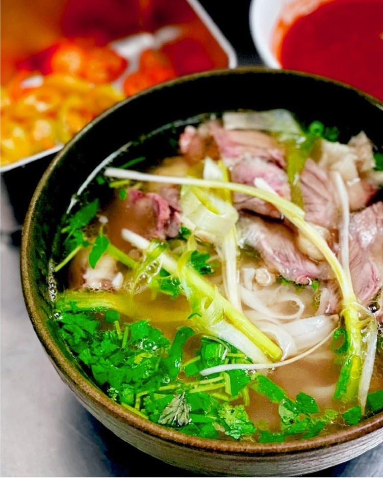Cuối cùng, rắc hành, rau thơm lên trên cùng và múc nước dùng phở vào là có bát phở ngon. Bạn có thể ăn kèm thêm tương ớt, giấm, tỏi nếu thích.