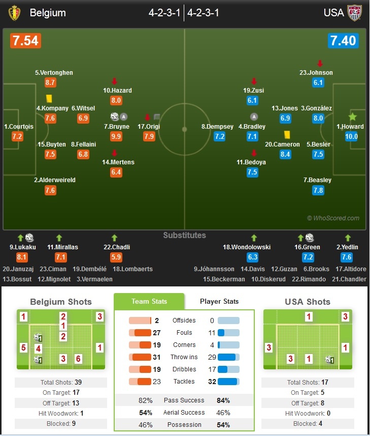 Nhiều lúc tưởng như khung thành của Mỹ đã bị bóp nghẹt trước làn sóng tấn công như vũ bão của Quỷ đỏ. Tuy nhiên, trong một ngày thi đấu xuất thần, thủ thành Tim Howard đã từ chối mọi cơ hội dành cho tuyển Bỉ. Theo thống kê, thủ môn của Everton đã có tới 11 pha cứu thua xuất sắc giúp Mỹ tránh khỏi việc để thủng lưới trong 90 phút thi đấu chính thức.