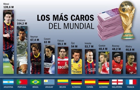 | Top 10 ngôi sao "đắt" nhất World Cup 2014: 1- Leo Messi (Argentina) - 139,6 triệu euro 2. Cristiano Ronaldo (BĐN) - 104,2 triệu euro 3. Neymar (Brazil) - 67,4 triệu euro 4. Edinson Cavani (Uruguay) - 63 triệu euro 5. Falcao (Colombia) - 59,1 triệu euro 6. Mesut Ozil (Đức) - 54 triệu euro 7. Iniesta (TBN) - 53,7 triệu euro 8. Goetze (Đức) - 48,4 triệu euro 9. Rooney (Anh) - 48,2 triệu euro 10. Ribery (Pháp) - 46,8 triệu euro |