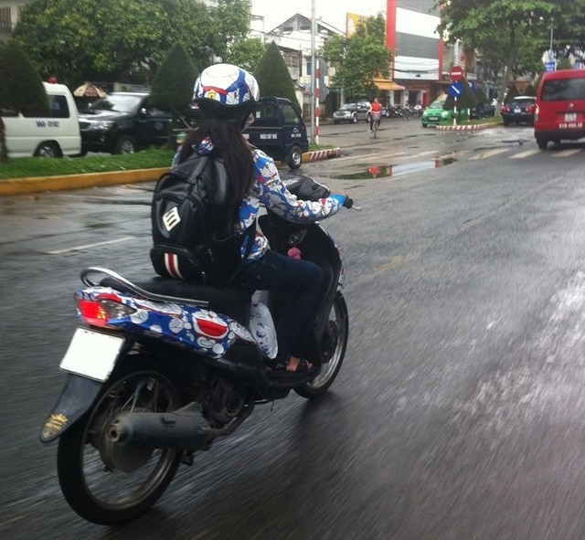 Trong ảnh, cô gái chạy xe tay ga, bị chụp sau lưng, gây chú ý bởi từ xe, áo khoác ngoài, đến mũ bảo hiểm đều có hình tượng nhân vật phim hoạt hình Đôrêmon. Bức ảnh do thành viên Andree Nguyễn đăng tải đã thu hút hơn 20.000 lượt xem, 10.000 lượt chia sẻ, cùng hàng trăm bình luận.